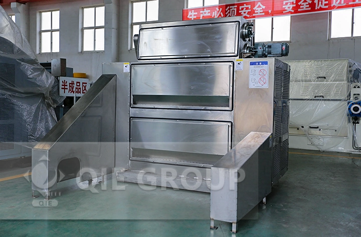 During operation, the material is broken into uniform particles while maintaining low powder formation. The discharged material meets the required size distribution for downstream flaking and extraction processes.